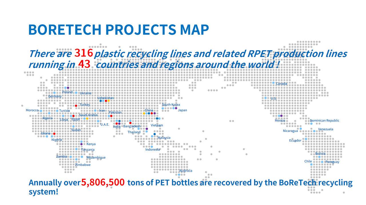 4. More than 300 BoReTech PET bottles washing lines and PET bottle recycling equipment are running over the world, which including the Fortune 500 company.